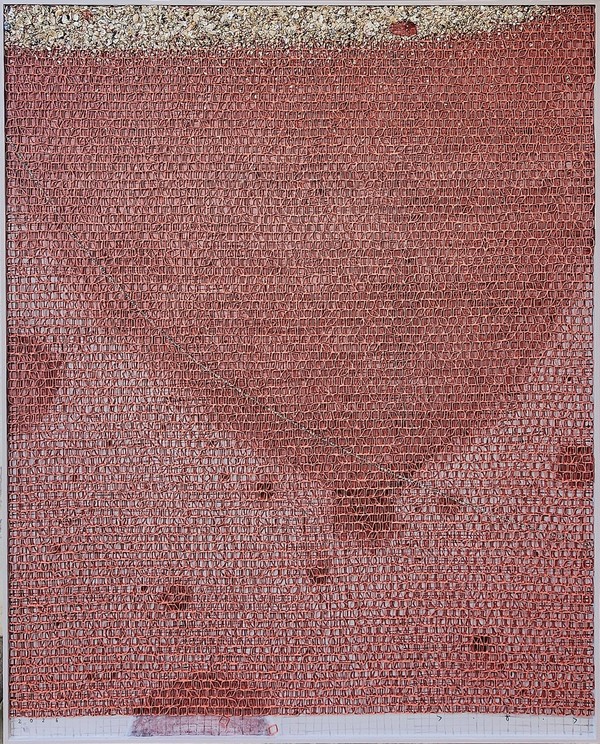 김형길의 작업은 처음 마주할 때 질서와 반복의 세계처럼 보인다. 수없이 반복되는 작은 구조들은 화면을 가득 채우며 일종의 안정된 패턴을 형성하는 듯하다. 그러나 가까이 다가갈수록 그 질서는 완전하지 않다. 미세하게 흔들리는 격자, 일정하지 않은 밀도, 그리고 그 위를 덮고 있는 소금과 조개껍데기의 입자들은 이 구조가 끊임없이 무너지고 다시 생성되는 과정에 있음을 드러낸다.