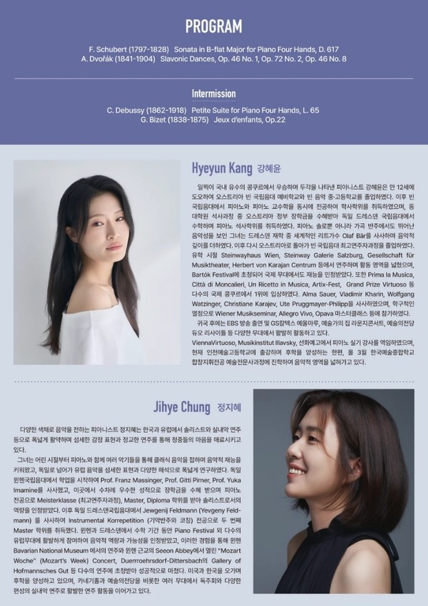 이번 공연은 단순한 레퍼토리 나열이 아니라, 서로 다른 감각과 해석이 하나의 호흡으로 이어지는 여정에 가깝다. 프란츠 슈베르트의 ‘네 손을 위한 소나타’로 시작해 안토닌 드보르자크의 ‘슬라브 무곡’, 클로드 드뷔시의 ‘작은 모음곡’, 조르주 비제의 ‘어린이 놀이’까지 이어지는 프로그램은 감성과 색채의 변화를 섬세하게 펼쳐낸다.