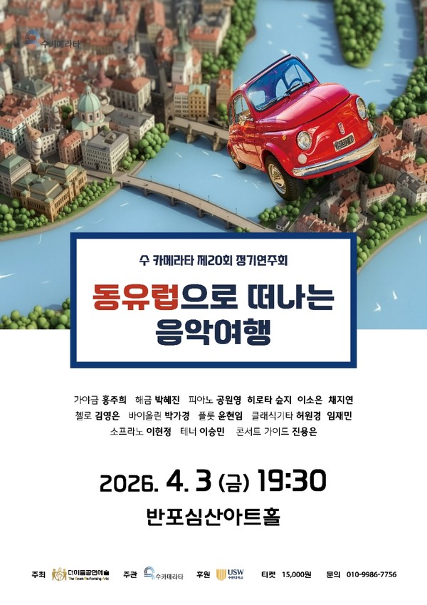 따뜻한 봄바람이 스며드는 4월의 저녁, 음악이 여행이 되는 시간이 열린다. 수카메라타 제20회 정기연주회 ‘동유럽으로 떠나는 음악여행’이 4월 3일 오후 7시 30분 반포심산아트홀에서 관객을 만난다. 이번 공연은 우리 곁에서 시작해 동유럽으로 이어지는 감성의 여정을 담아, 낭만과 서정이 어우러진 무대로 기대를 모은다.