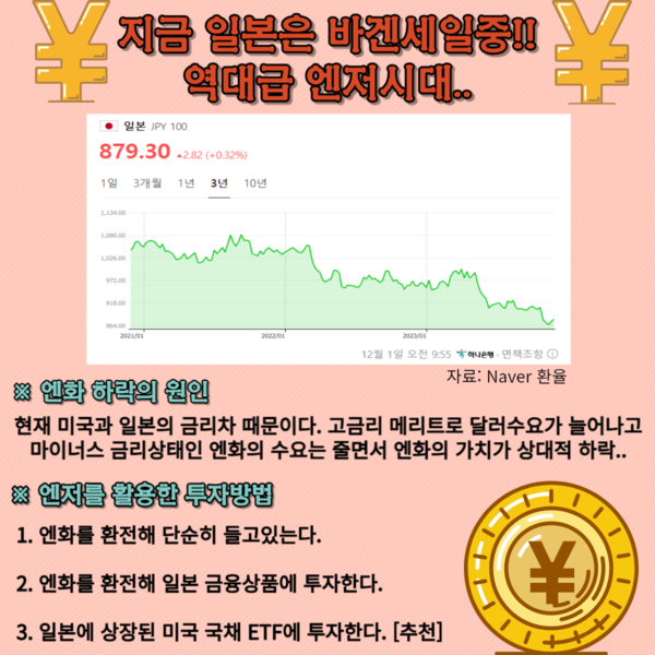 그래서 오늘은 엔화가치 폭락의 원인과 엔저 시대를 활용한 투자 방법 몇 가지에 대해 간략히 글을 작성해 보았습니다.