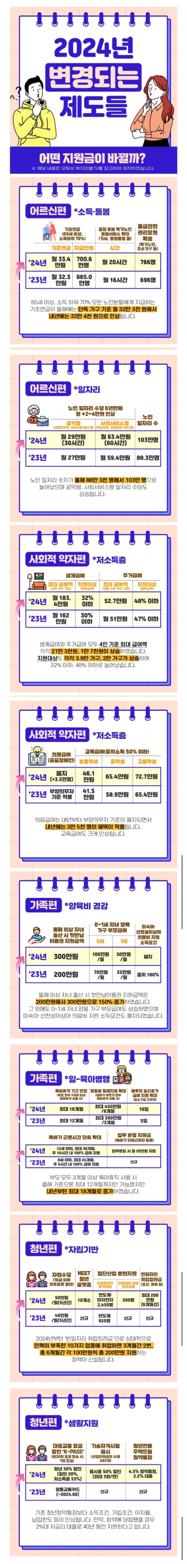 그래서 제가 오늘은 2024년부터 달라지는 국가지원제도를 한눈에 알아볼 수 있게 정리해보았습니다.