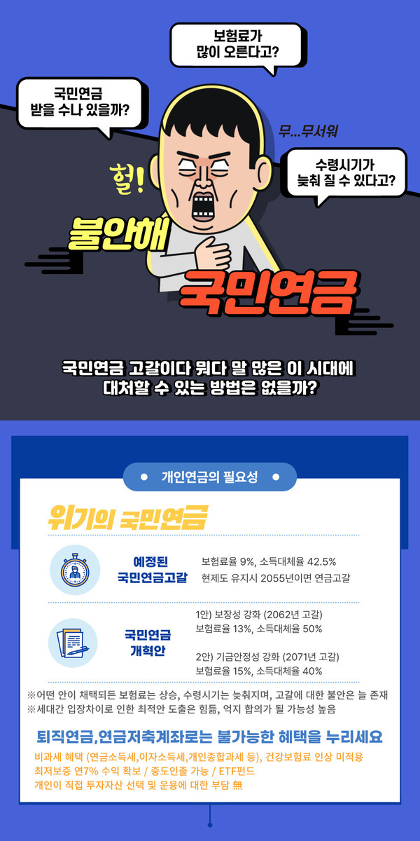 앞으로 연금액 축소 등 국민연금의 개혁은 불가피한 현실이고, 개인의 연금은 스스로가 어느정도 준비하지 않으면 안되는 시대가 왔습니다.